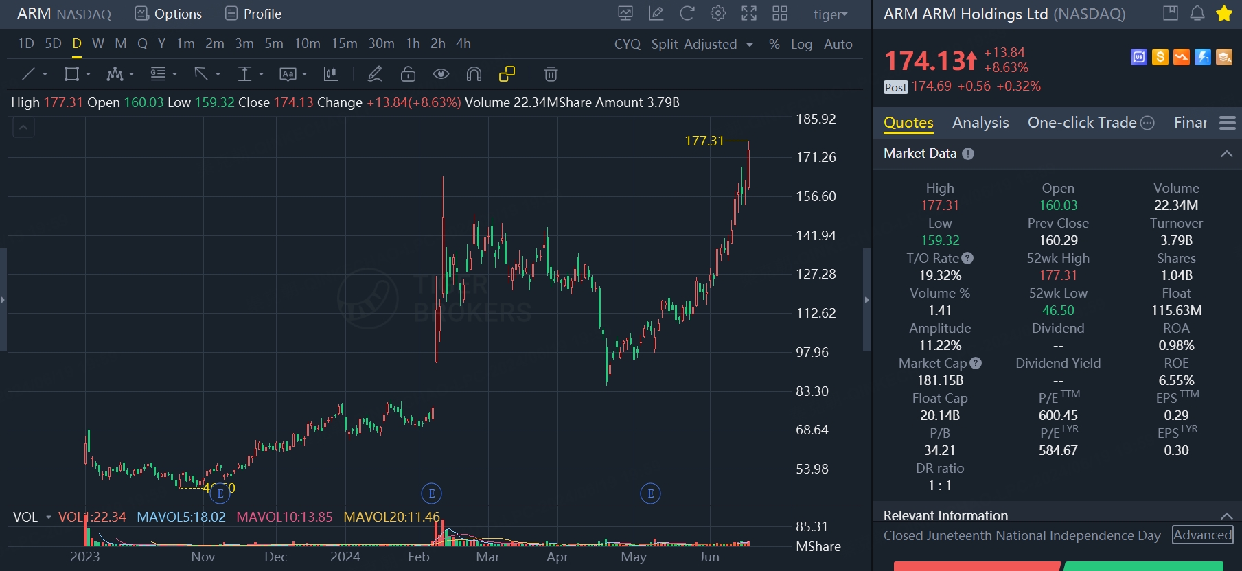 较小的流通盘,有利于炒作,当下AI概念如此火爆,加上ARM确实充分受益,资金稍稍追捧,股价便会涨到天际。