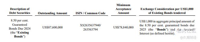 发行人和担保人特此宣布交换要约的最新结果。发行人和担保人决定在到期日之后接受根据交换要约投标的额外20万美元的现有债券,因此,截至本公告发布之日,已有87,600,000美元的现有债券(占现有债券未偿本金的100%)根据交换要约有效接受及交换。