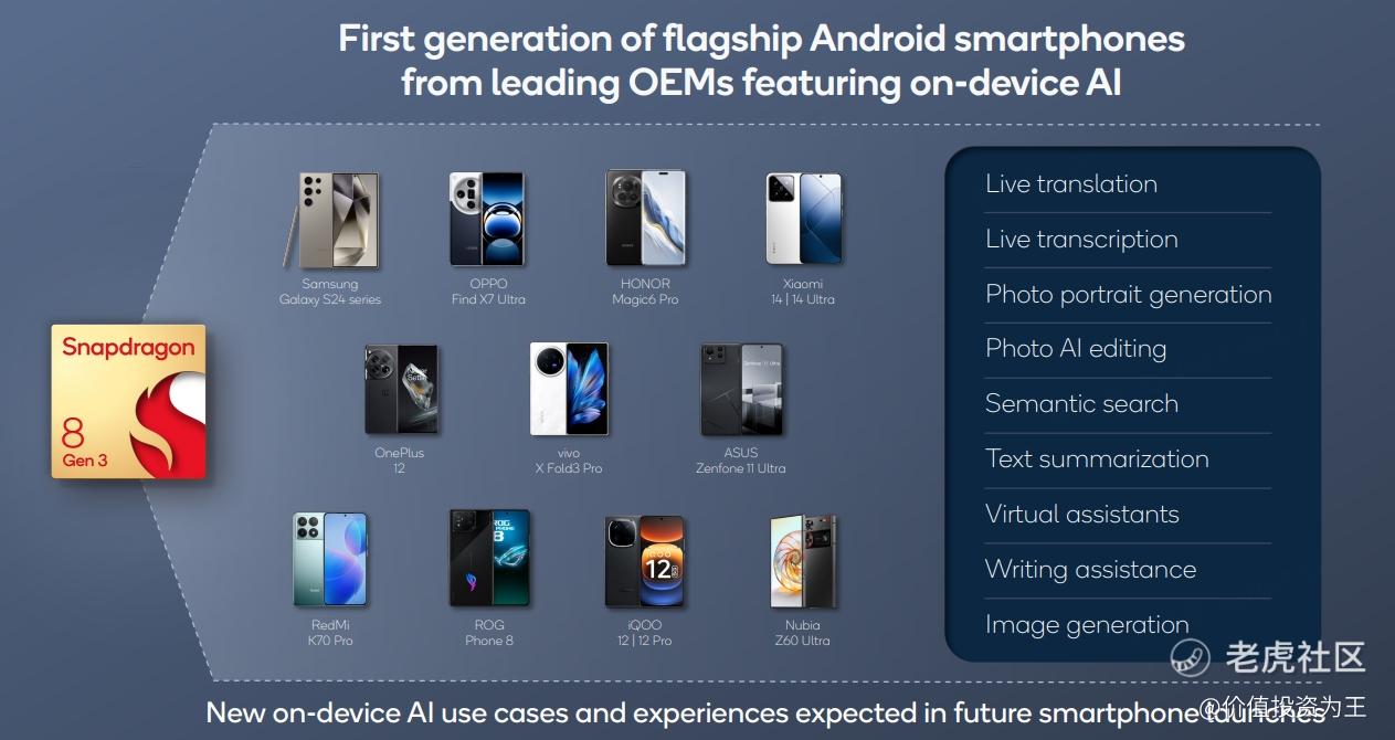 首先是AI手机,众所周知,高通是手机芯片巨头,几乎垄断了安卓机,甚至苹果也需要购买高通的基带芯片。