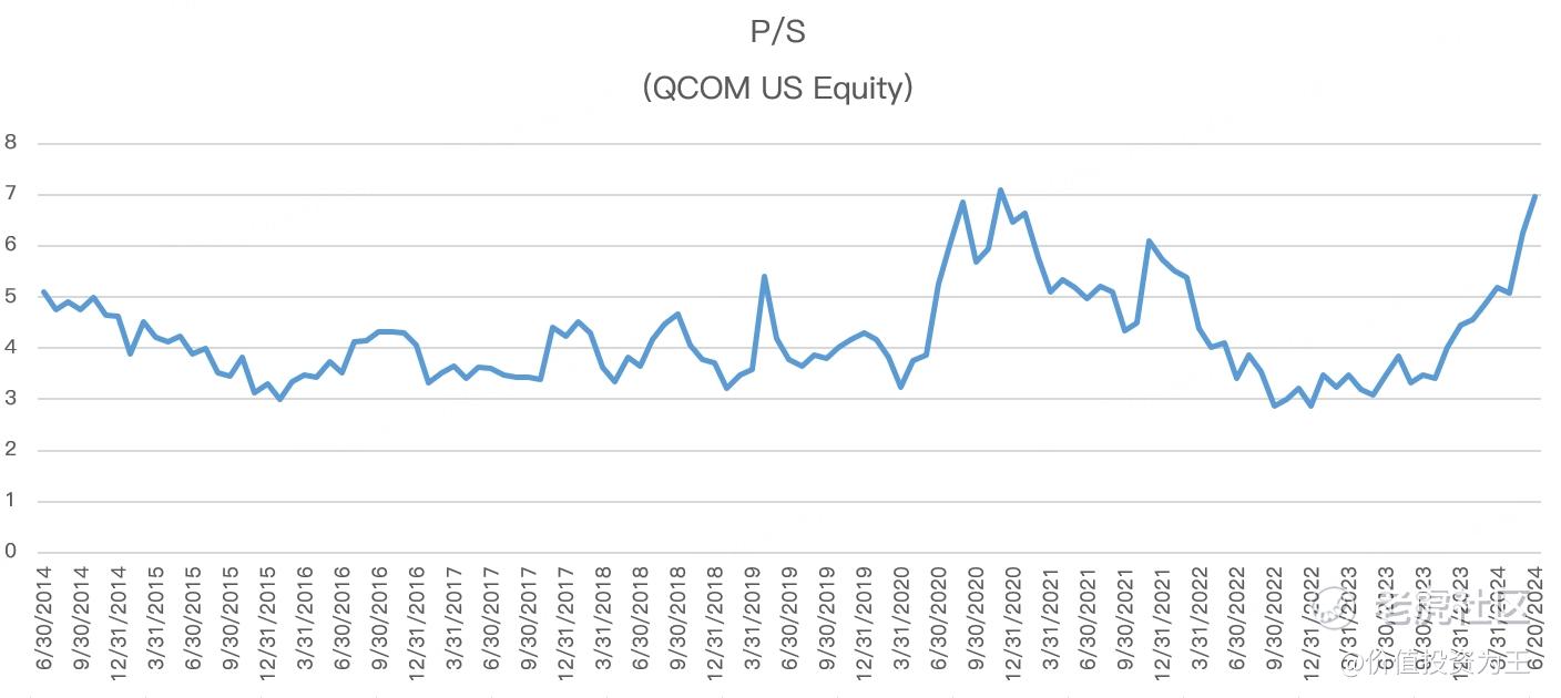 由此来看,高通充分受益AI,但暴涨过后,高通的市销率估值已经触及历史高位: