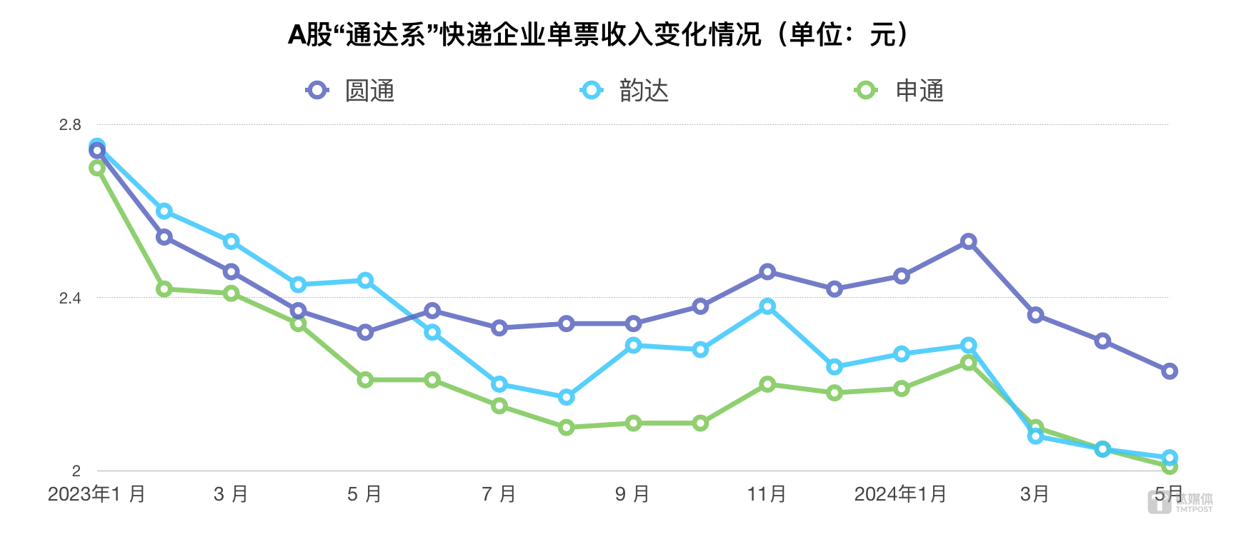 今年5月,圆通速递、韵达股份、申通快递的单票收入均已跌至近年最低点,分别为2.23元、2.03元、2.01元,韵达股份和申通快递的单票收入已经逼近2元关口,显示价格战依然激烈。