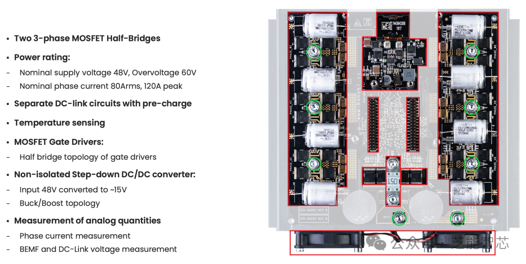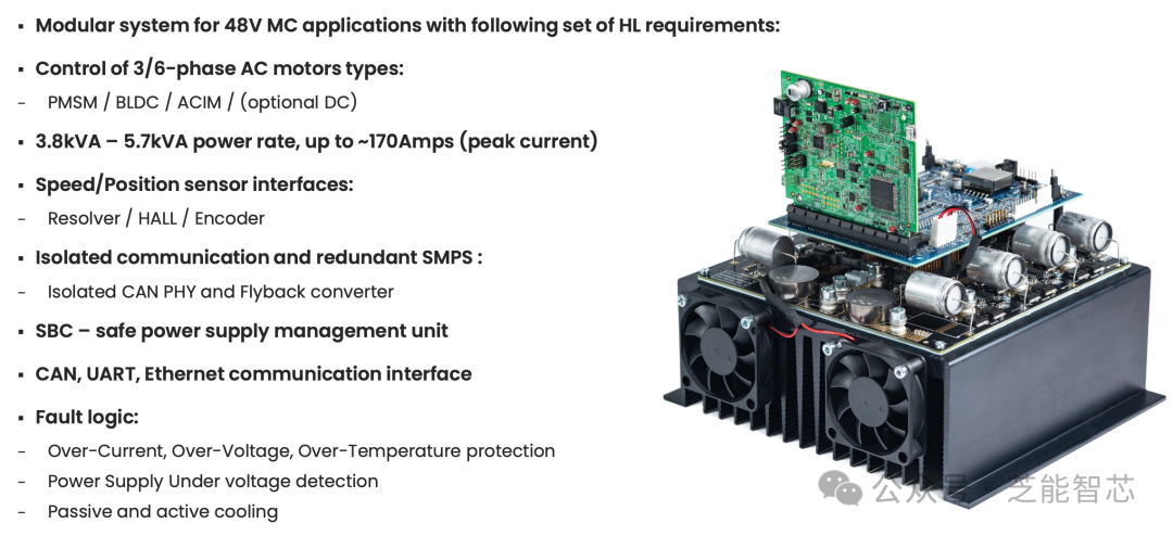 ● 模块化系统:适用于48V电机控制应用,能控制3/6相交流电机,功率范围高达5.7kVA,峰值电流可达约170安培。