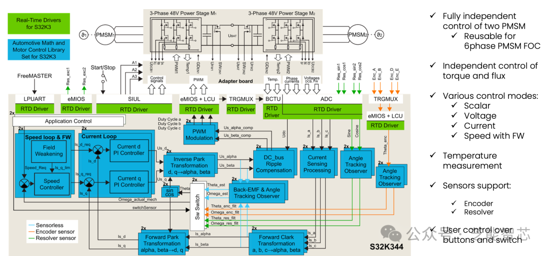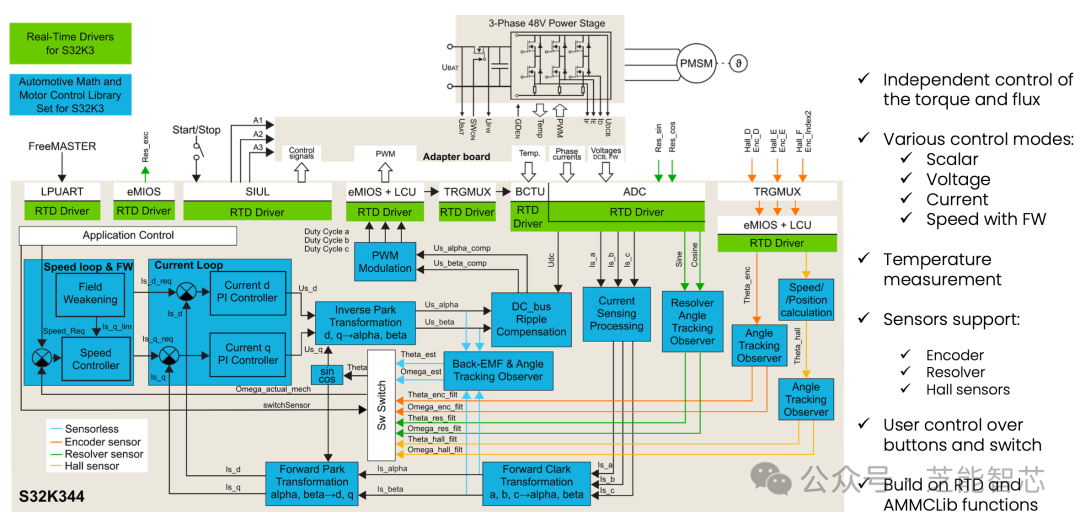 ● 广泛兼容的传感器处理接口:支持Resolver、编码器、霍尔效应等多种类型的转子位置传感器,以及电流信号的监测与过流保护。