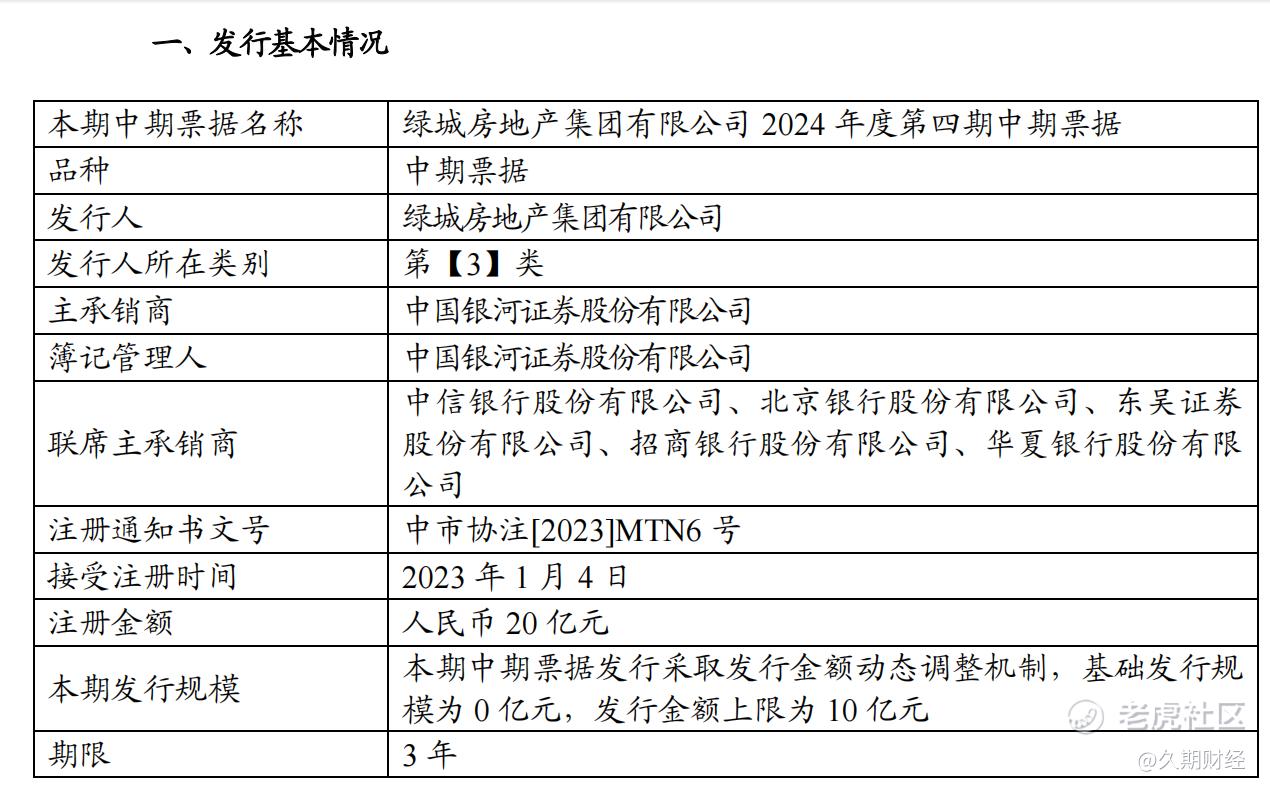 久期财经讯,绿城房地产集团有限公司(简称“绿城房地产集团”)发布2024年度第四期中期票据发行方案。