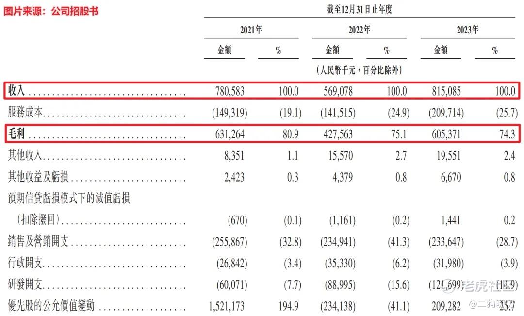 利润方面:公司在2021年、2022年、2023年毛利润分别为6.31亿元、4.28亿元、6.05亿元,同期毛利率分别为80.9%、75.1%、74.3%,即使抛去2022年疫情影响,公司毛利率也一直在走下坡路。经调整公司净利润分别为2.38亿元、0.85亿元、2.26亿元。