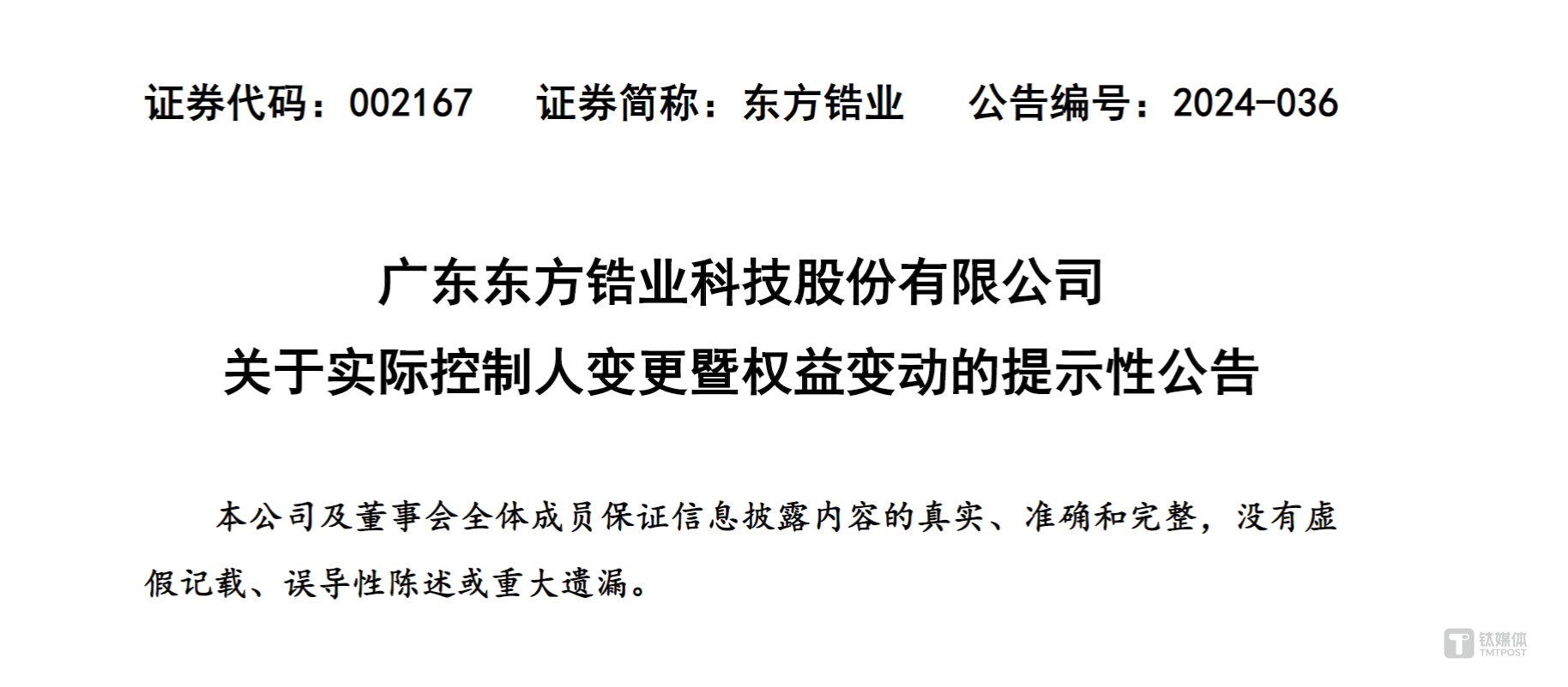 6月20日晚间,龙佰集团(002601.SZ)以及控股子公司东方锆业(002167.SZ)同步发布了实控人变更的提示公告,宣布公司实控人由许刚变更为许冉。