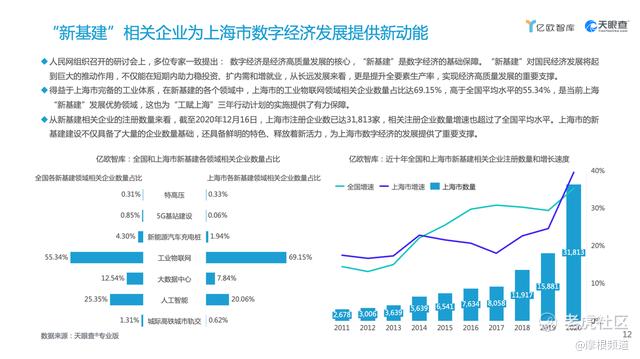 从新基建相关企业的注册数量来看,截至2020年12月16日,上海注册企业数已达31,813家,相关注册企业数量增速也超过全国平均水平。上海新基建建设不仅具备了大量的企业数量基础,还具备鲜明特色、释放新活力,为上海数字经济发展提供了重要支撑。