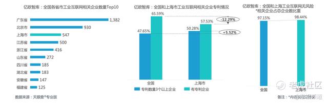 工业互联网,是第二产业数字化代表行业。据天眼查数据显示,上海市工业互联网相关企业547家,位居全国第三,拥有3个及以上专利企业占比50.28%,高于全国水平;无风险企业占比98.44%,基本和全国持平,行业整体呈低风险状态。