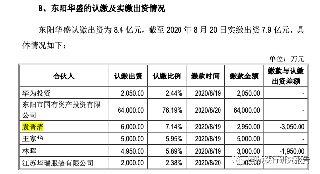 即使是打着华为的牌子,收购一个上市公司控股权还是要真金白银的,袁晋清先是找到了山东国资,不过没有成功,厉害的是,在看起来一定是黄掉的情况下,袁晋清找到了浙江东阳的国资,东阳人在10天之内办好决策并且汇出了6.4亿元,而且袁晋清通过普通合伙人的身份控制了收购上市公司的合伙人企业东阳华盛。