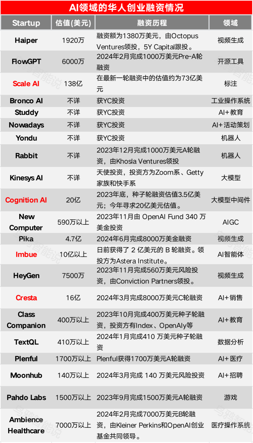乌鸦君搜罗到20+家备受瞩目的华人初创AI公司、30+位华人创业者,估值总额约191.4亿美元(约合1388亿人民币)!他们中跑出4家独角兽,95后创业占一半。