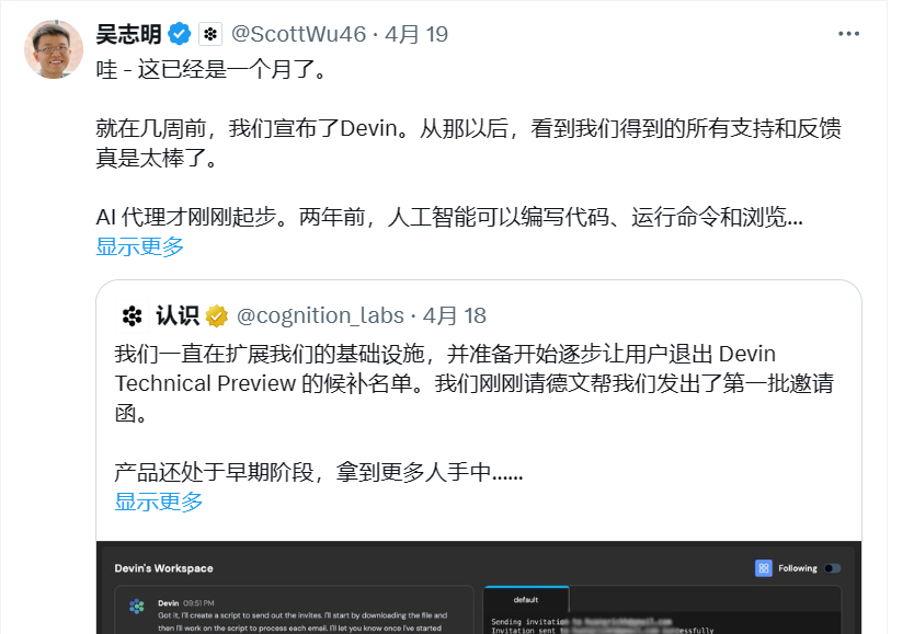 AI初创公司CognitionAI旗下AI程序员Devin上线几周即获20亿美元融资,母公司估值半年内翻6倍达20亿美元。该公司拥有者华人金牌程序员团队:CEO Scott Wu,CTO Steven Hao,CPO Walden Yan。