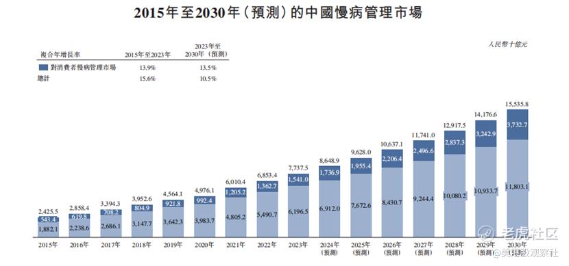 未来,在老龄化的大趋势下,慢性病患者持续增加,对慢性病管理的需求将会持续增长,也将带动方舟云康整体规模的可持续发展。根据灼识咨询的资料,按商品交易总额计,中国慢病管理市场的整体规模由2015年的24,255亿元快速增长至2023年的77,375亿元,年复合增长率为15.6%,并预期到2030年达到155,358亿元,2023年至2030年的年复合增长率为10.5%。其中,对消费者的慢病管理市场从2015年的5,434亿元增长到2023年的15,410亿元,并且预计到2030年达到37,327亿元,2023年至2030年的年复合增长率为13.5%。而互联网对消费者的慢病管理市场的渗透率还相对较低,2023年仅为2.9%,灼识咨询预计到2030年将会达到16.1%,总交易规模也将达到5,995亿元,2023年到2030年的年复合增长率达到44.5%,远超过行业的整体增速。