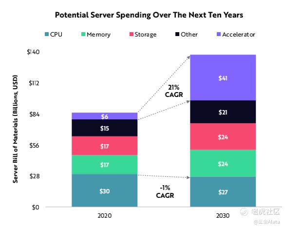 1,服务器处理器替代。ARM处理器正在利用规模优势破坏英特尔的移动生态系统。RISC-V将开源原则应用于硬件,也正在成为低成本领域的标准。ARM和RISC-V的市场份额将在2020年从零增长到零到2030年将占到服务器市场的71%。(AMD,$台积电(TSM)$ )