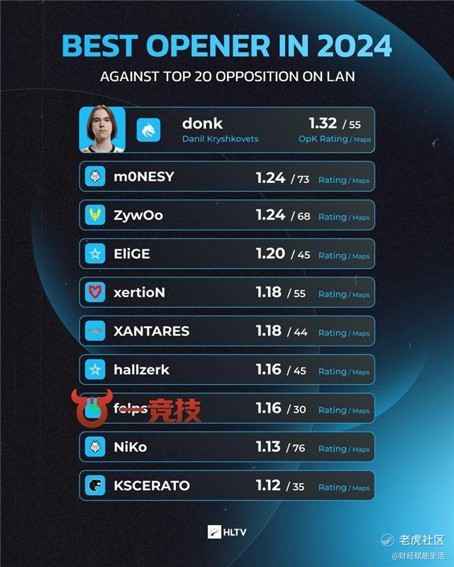 2、HLTV发布了2024年上半年最佳破局者榜单,donk以55张地图中1.32的OpK评分成功占据榜首。紧随其后的是G2当家狙击手m0NESY,以73图1.24的OpK评分排名第二。法国巨星ZywOo则是以68图同样1.24的OpK评分屈居第三。