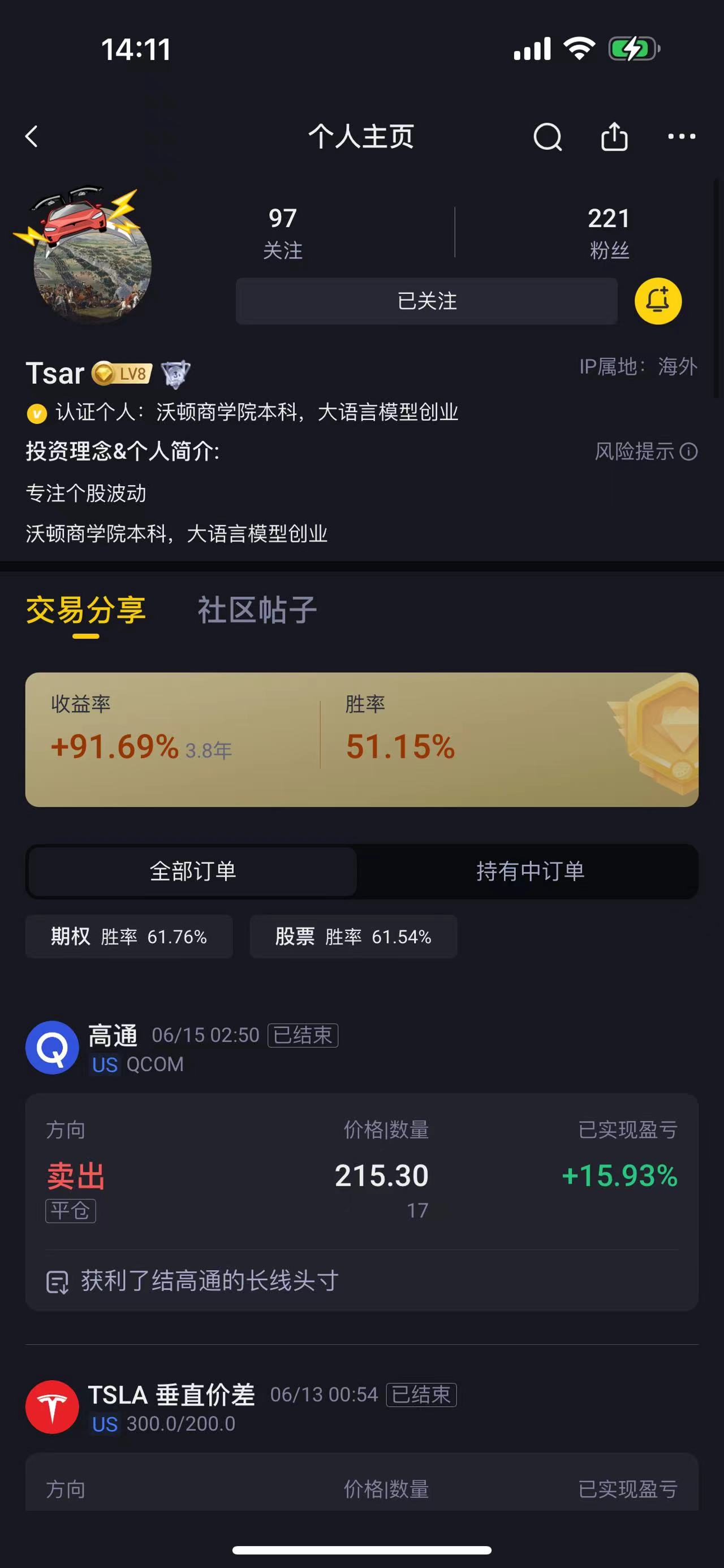 交易分享者提供的信息仅供参考,不构成投资建议。交易分享者的交易不代表老虎的任何立场。投资者应根据自身财务状况、投资目标等情况自主做出投资决策并承担投资风险,老虎不承担任何责任。期权交易风险较高,不适合所有投资者。投资有风险,入市需谨慎。