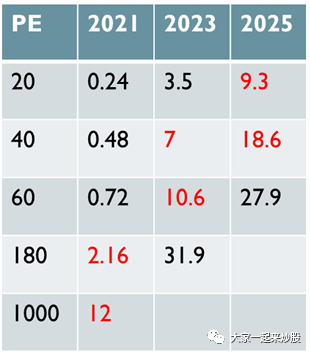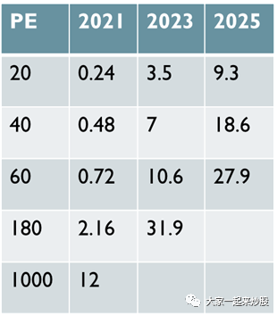 文章开头算出了当前股价的市值为4.626B。上面的盈利部分可以看到,2023到2025年复合增长率为60%,25-27为35%。于是,我们可以用20,40,60,180,1000来当作PE的几个不同标准。20是PE比较低的科技行业,40是当前大量印钱阶段,规模大且稳定的科技公司的PE,60为23-25年增长率对应的PE,180为当前行业领头宁德时代的PE(比亚迪为150,和宁德差不多),1000为特斯拉的PE。由此得出下图: