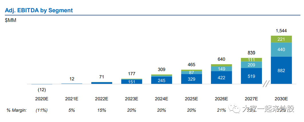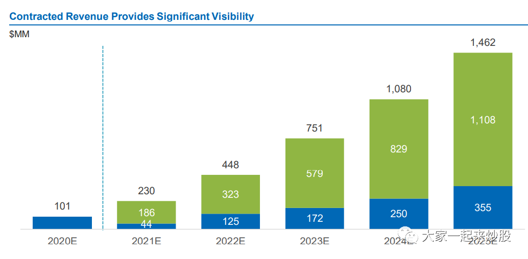 2022-2027,已经签了1.5B(B-十亿)的合同。预计2025收入超过2.3B,到2025有4.1B的流水。上图中,蓝色为已经确定的收入,绿色为预期收入。增长速度还是很可观的。
