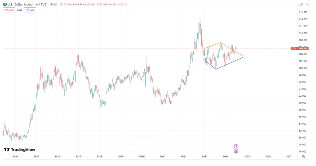 而从美元指数全盘的情况来看,我们之前讲过钻石形态突破之后,美元向上的机会还是比较明显的。换而言之,美元走强会是大概率事件。然而需要注意的是,在形态突破后,市场的整体波动率还是处于明显低位的,并未有加速或者轧空的行情。这还是美国降息预期一拖再拖,欧洲央行提前降息的状况下。基于此,我们的判断还是金融市场需要有动荡才会引发美元走出波澜壮阔的上涨。