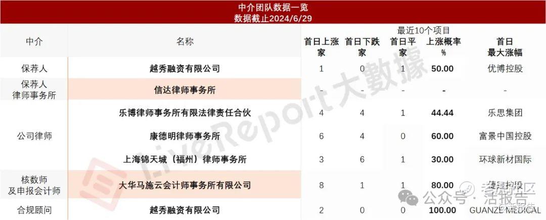 据LiveReport大数据统计,高龙海洋集团中介团队共7家,其中保荐人1家,近10家保荐项目数据表现一般;公司律师共计3家,综合项目数据一般。整体而言中介团队历史数据表现一般。