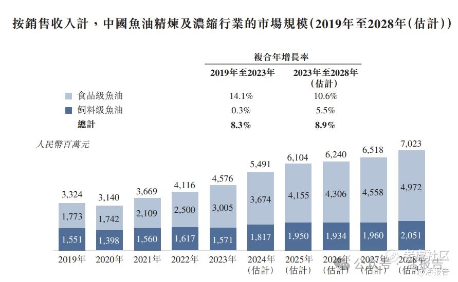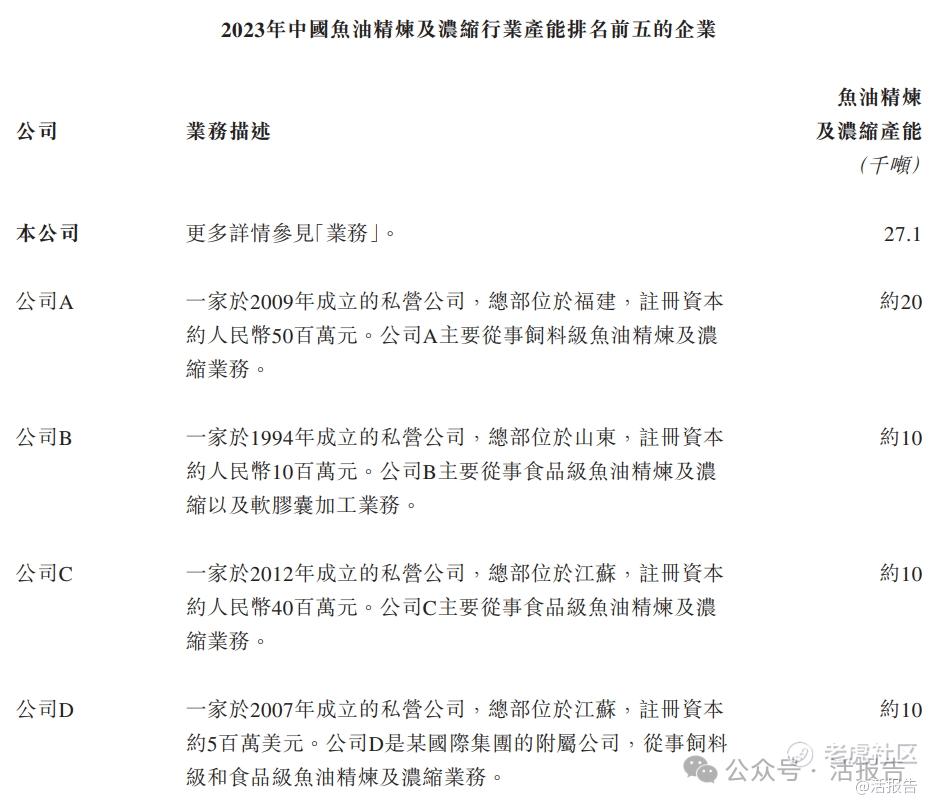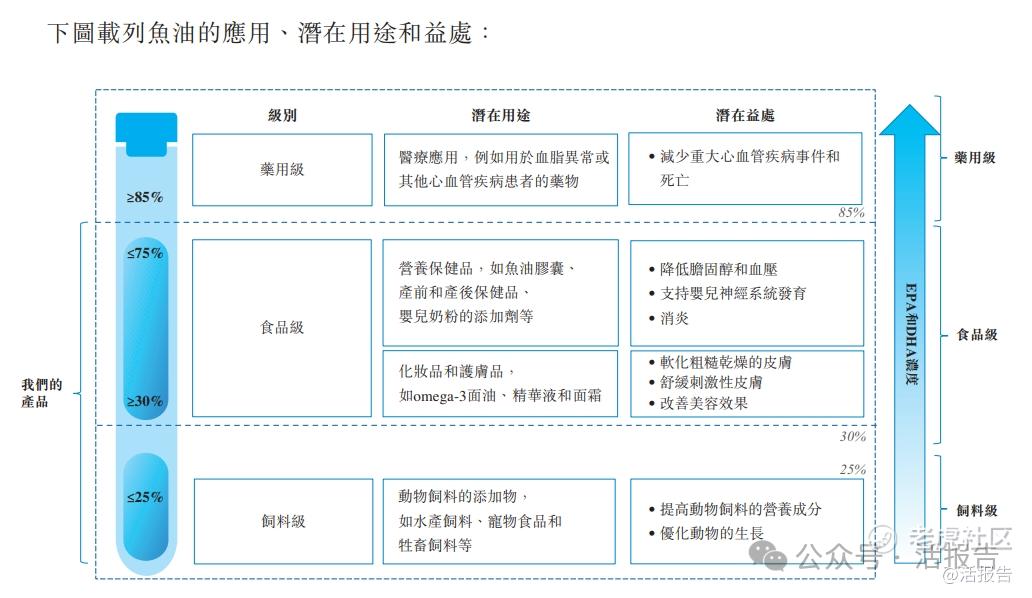 公司于主要将毛鱼油精炼和浓缩成具有各种EPA和DHA含量的优质饲料级和食品级鱼油产品。鱼油含有丰富的omega-3长链多不饱和脂肪酸,包括EPA和DHA,是对人类和动物健康至关重要的必需营养素。公司的产品大致可分为两类,即(i)EPA和DHA组合比例为25%或更低的饲料级鱼油,用于动物饲料补充其营养成分,及(ii)EPA和DHA组合比例为30%至75%的食品级鱼油,可用于生产供人类食用的鱼油胶囊及保健品或由公司客户进一步加工成药用级鱼油。根据相关报告,公司能够提炼和浓缩EPA和DHA比例高达75%的食品级鱼油,这在中国被认为是先进的水平。