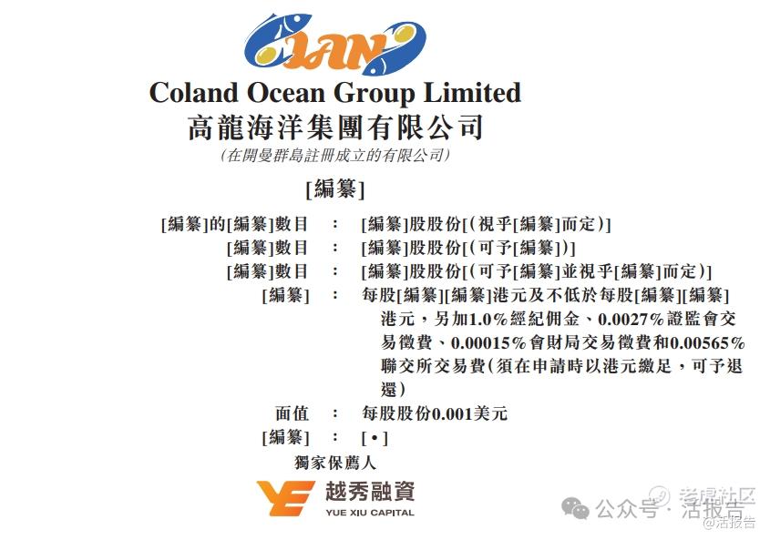 LiveReport获悉,成立源于1994年的高龙海洋集团有限公司 Coland Ocean Group Limited(以下简称“高龙海洋集团”)于2024年6月28日在港交所递交上市申请,拟香港主板上市。这是该公司第1次递交上市申请,独家保荐人为越秀融资。