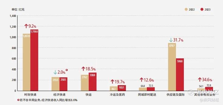 2023年顺丰供应链及国际分部的净亏损为5.35亿元,而2022年同期的净利润约为19亿元,同比由盈转亏,大幅下滑127.47%。