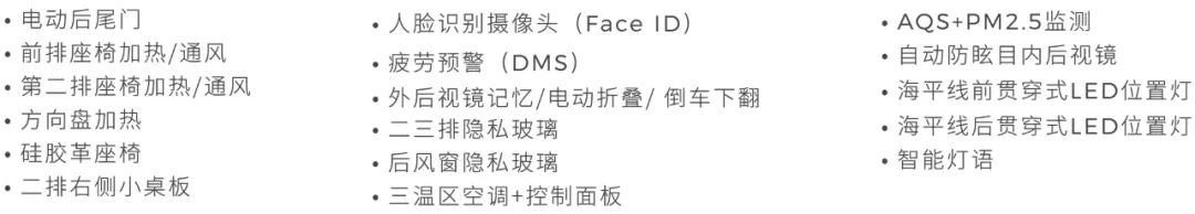 质保礼:免费整车终身质保(限首任车主且非营运),免费三电终身质保(限首任车主且非营运);