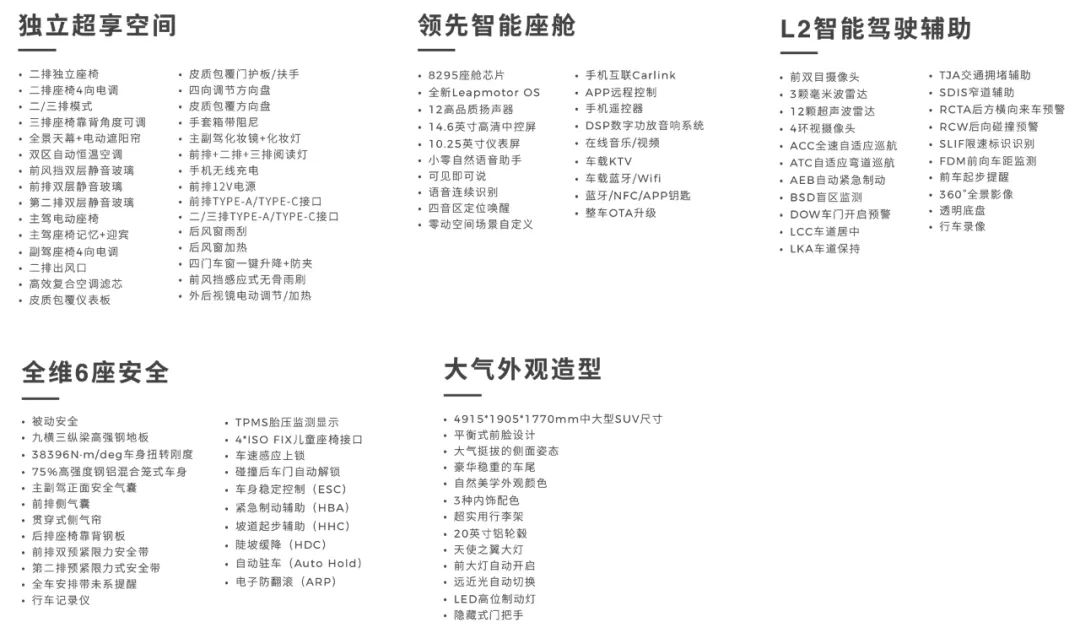 零跑C16入门车型已经拥有远超同级的智能舒享体验,智享版标配三排六座2+2+2黄金布局的舒适座舱、高通SA8295P顶尖智能座舱,L2级智能驾驶在内的超过100项智能舒享配备,轻松拥有6座移动幸福之家: