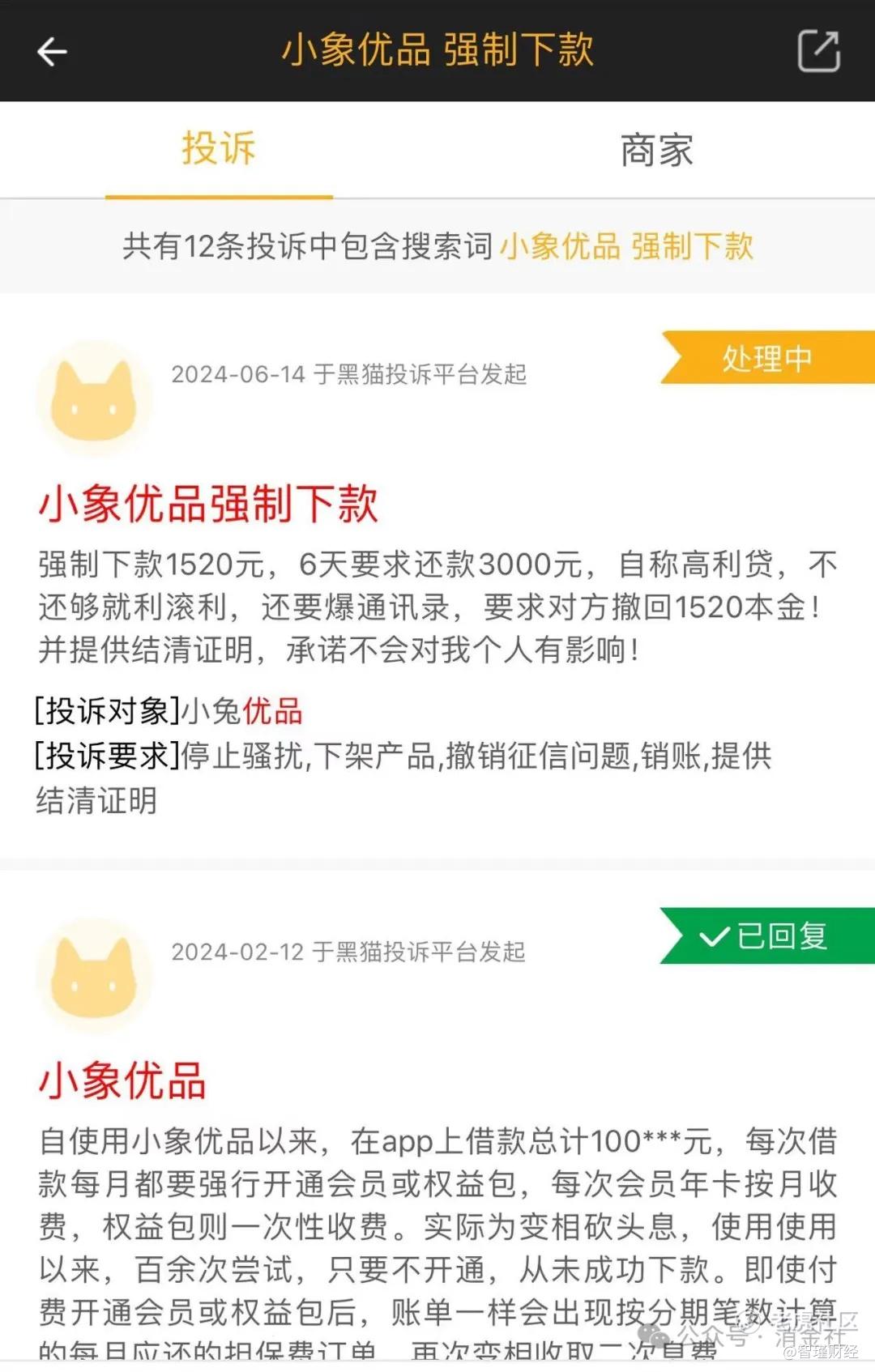 消金社在黑猫投诉平台检索关键词“优品”二字发现,“小象优品”App近期有用户投诉其涉嫌“强制下款”。