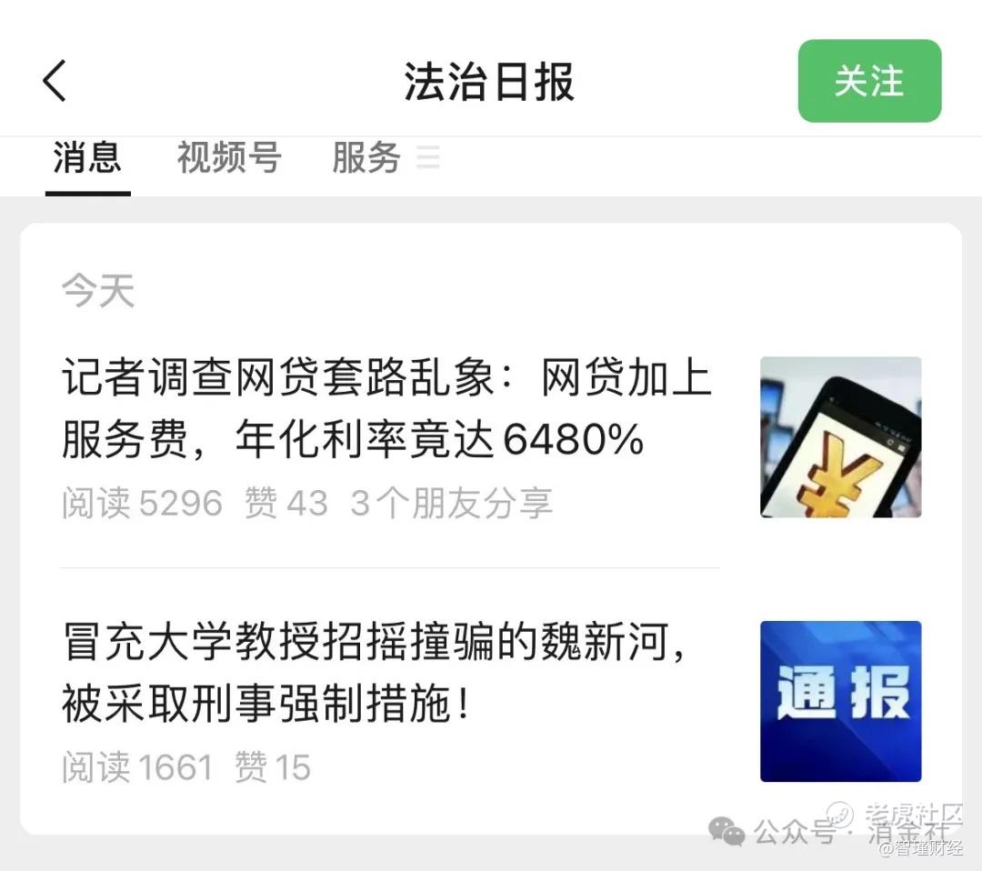 消金社获悉,中央政法委机关报—《法治日报》发布记者调查报道,“记者调查网贷套路乱象:网贷加上服务费,年化利率竟达6480%”!
