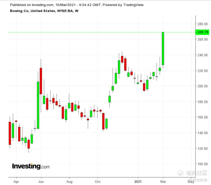 这家总部位于芝加哥的飞机制造商的反弹尤为引人注目,波音仅在过去5个交易日就上涨了20%以上,周一收于265.63美元。公司这次的势头非常强劲,其在2021年的涨幅是道指的三倍多。