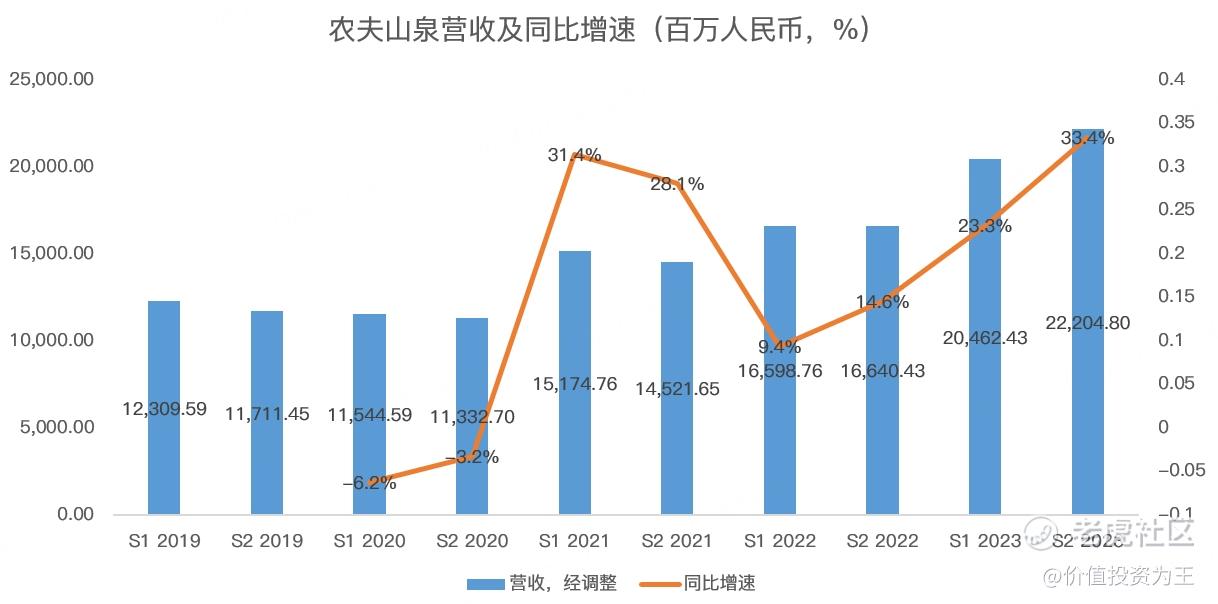 估值高≠就要崩盘,从业绩上看,农夫山泉上市以来的表现非常亮眼,去年下半年的营收增速依然高达33.4%:
