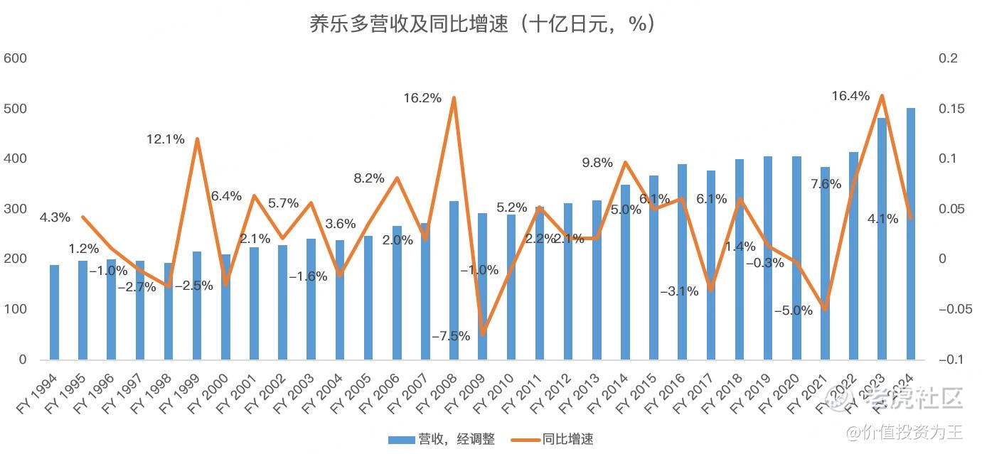 而养乐多之所以能够在金融危机之后迎来重生,很大程度上是靠出海带动,日本国内的收入增长并不明显:
