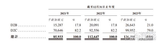 分业务来看,D2C是SYNAGISTICS公司的收入主要来源,2023年该业务收入达9995.2万新加坡元,占公司总收入比重的79%。这一占比较前两年有所下降,主要源于公司发力D2B业务,该业务收入由2021年的1528.7万新加坡元增长至2023年的2664.3万新加坡元,比重也由17.8%提升至21.0%。