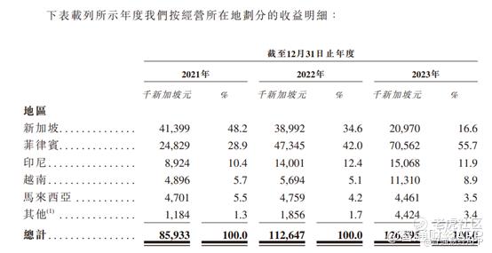 分地区来看,新加坡及菲律宾是公司的主要收入来源。但由于许多品牌要求在新加坡作出前期存货购买,而SYNAGISTICS自2022年起战略性地调整为D2C业务下的按需存货模式,导致新加坡的销售额从2021年的4139.9万新加坡元下降至2023年的2097万新加坡元。菲律宾地区的收入则由2021年的2482.9万新加坡元提高至2023年的7056.2万新加坡元,占比达到55.7%。可见,菲律宾地区的业务收入将极大影响公司的总收入。