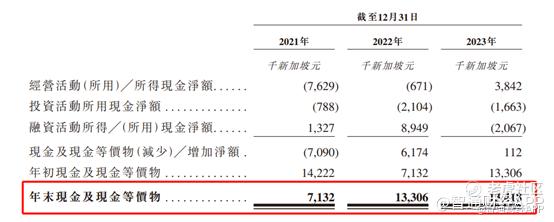尽管毛利率下滑,但通过消除前期大量购买的库存,SYNAGISTICS得存货周转天数由2021年的22.4天减少至2022年的17.0天,并进一步下降至2023年的7.8天。不仅如此,SYNAGISTICS的现金流也得到明显的改善,其年末现金及现金等价物由2021年的7132万新加坡元增长至2023年的1.34亿新加坡元。