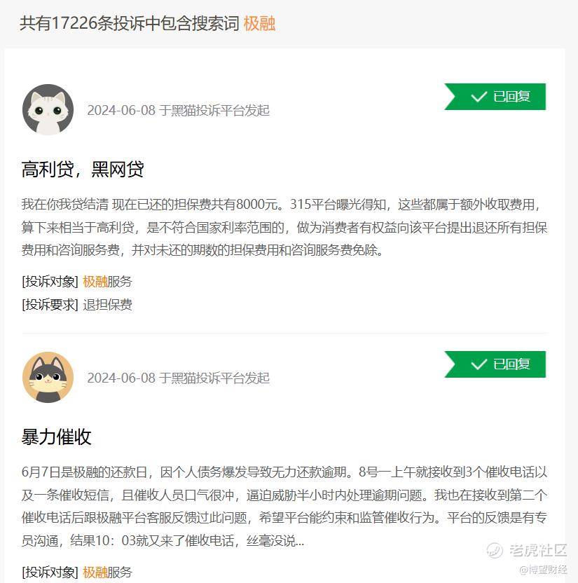 截止6月29日,在黑猫投诉上搜索“极融”投诉量有17226条,投诉情况多为额外收取借款人担保费、咨询费、极享黑卡服务费,暴力催收,爆通讯录等等。而”你我贷”的累计投诉量更是高达69628条,变相高利贷问题尤为突出。