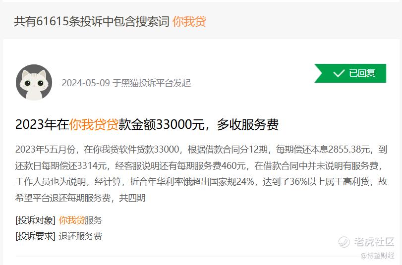 有用户反映,于2023年9月在你我贷平台贷款12900元分12期还款,截止目前已还款9期,剩余3期待还,未发生逾期,平台除了收取利息之外,每个月还额外收取担保服务费108.36元及融资咨询服务费76.11元,总费用核算下来收取的费用高达年化约37.7%,平台通过组合费用(利息 担保服务费 融资咨询服务费)方式收取高额利息,并且无法查询到合同,该平台涉及违法行为。”