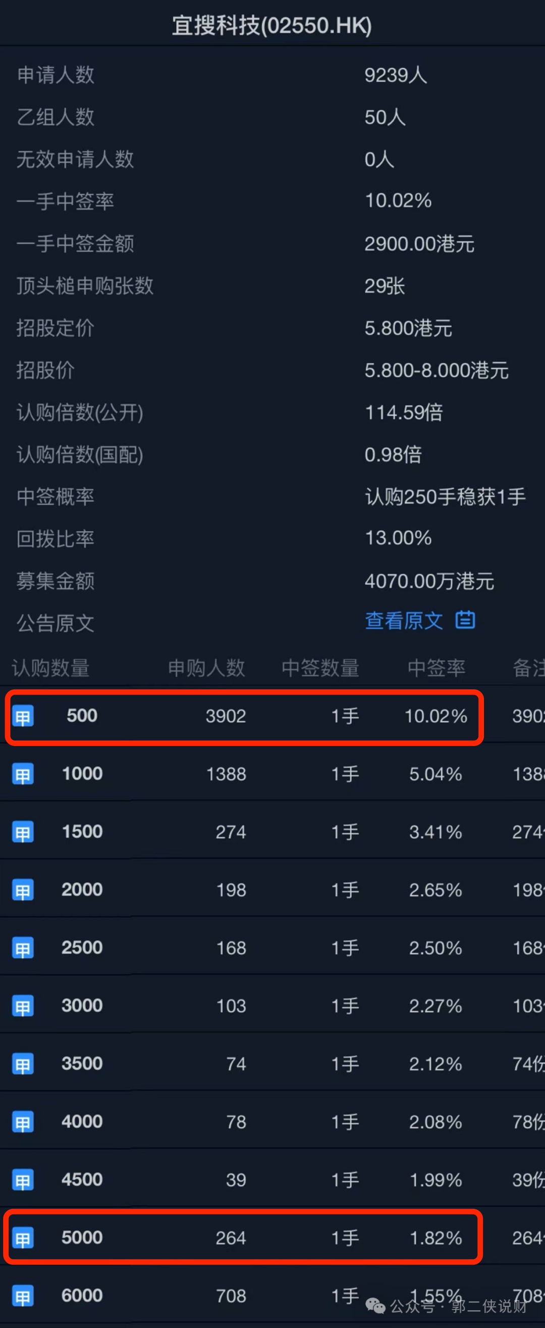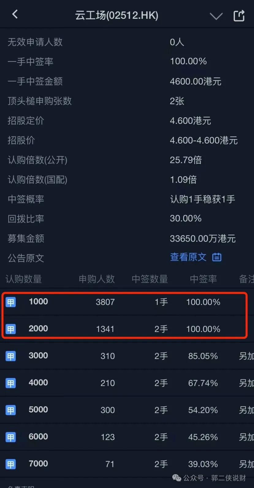 例如云工场,一手两手中签率100%,甲尾中签率才0.65%,一户中签6手。为啥这样安排,甲尾申购人数相比次甲尾陡增,一看就是庄家故意安排人打回拨把货分给小散户。