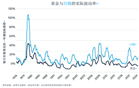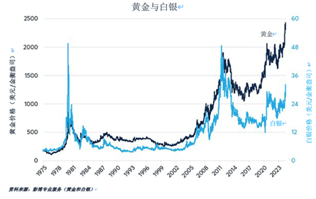 图4:2024年黄金价格突破历史新高,而白银价格依旧比1980年和2011年的峰值低40%