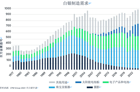1999年,摄影领域消耗了2.677亿金衡盎司的白银,占当年全球白银总供应量的36.6%。到2023,由于数码摄影的兴起,摄影领域仅消耗2,320万盎司的白银,约占当年白银总供应量的2.3%。与此同时,白银在电子产品和电池中的使用量从9,000万盎司增加到2.274亿盎司,占白银年度总供应量的比例从12.3%增至22.7%,这抵消了传统摄影领域需求下降的一部分影响,也在一定程度上解释了为何在近年黄金屡创新高的情况下,白银却难以触及新的价格顶峰。
