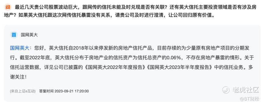还有多位投资者早在2023年9月,就在互动平台询问“网传的信托未能及时兑现”与国网英大是否有关联。当时公司的回复主要围绕房地产信托风险展开,也并未提及当时已经发生、但后来才被监管揭露的风险事件。