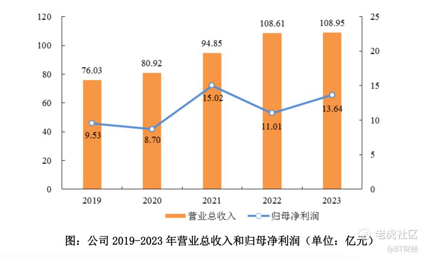 业绩数据显示,2023年,公司实现营收108.95亿元,同比微微增长0.32%;归属于上市公司股东的净利润13.64亿元,同比增长23.96%。