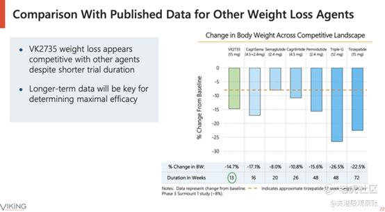仅13周的治疗后,15毫克剂量的药物显示出高达13.1%的安慰剂调整后的平均体重减轻(与基线相比为14.7%)。仅仅13周后,VK2735就显示出与长期测试的减肥药相比具有竞争力的结果。