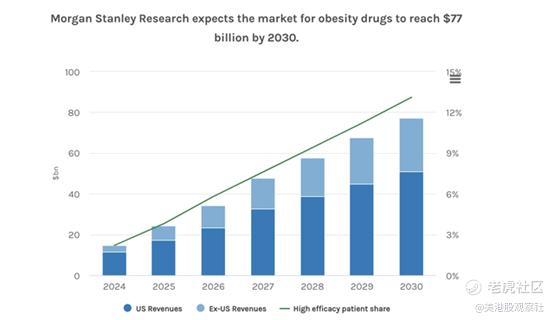 摩根士丹利估计,减肥药市场在2030年将有770亿美元的机会。美国市场仍然是主要的市场机会,研究表明,到2030年,全球7.5亿肥胖人群中只有12%的人会服用减肥药。
