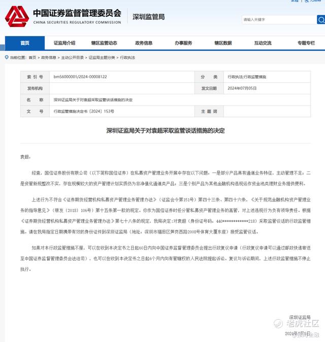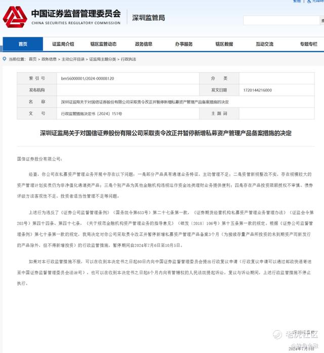 7月6日,国信证券发布公告称,因私募资产管理业务开展中存在违规问题,公司被深圳证监局采取行政监管措施——责令改正并暂停新增私募资产管理产品备案3个月(为接续存量产品所投资的未到期资产而新发行的产品除外),暂停期间自2024年7月6日至10月5日。