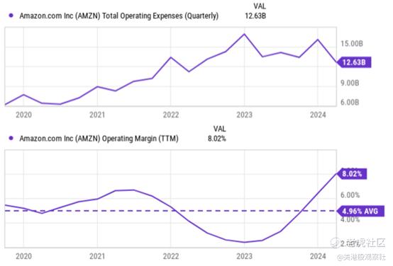 具有最直接的催化剂是其物流网络最近的区域化。这种催化剂大大降低了费用,可能比想象中的要多得多。为了更好地理解这种影响,下面的图表显示了亚马逊最近几个季度的运营费用(上半图)和运营利润率(下半图)。如下图所示,亚马逊的运营费用(OPEX)在过去几年中一直在快速增长,并在2023年达到近160亿美元的峰值。该公司已经采取了各种措施来控制成本,但成本直到2024年第一季度才开始明显下降。据报道,在过去的一个季度中,OPEX为126亿美元,比峰值水平低约20%。由于运营成本的大幅降低,营业利润率也随之大幅提高。可以看出,目前8.02%的营业利润率不仅远高于4.96%的历史平均水平,而且是至少五年来的最高水平。