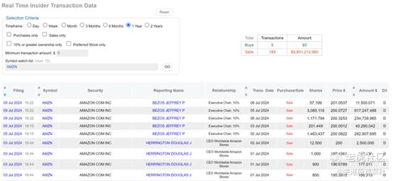 另一个潜在的不利因素涉及内部人士卖出。如下图所示,亚马逊内部人士在过去12个月出售了大量股票。数据显示,过去一年共报告了189起内幕交易,而且根本没有内部人士购买。最近的活动包括前首席执行官兼创始人杰夫·贝佐斯的销售活动。