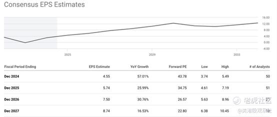 首先,该股目前的市盈率很高。如下图所示,亚马逊目前的预期市盈率为43.78倍。无论从绝对标准还是相对标准来看,这显然都是昂贵的。然而,由于上述催化剂推动每股收益增长,预计未来几年市盈率将迅速下降。例如,市场普遍估计,到2027财年末,预期市盈率将达到22.80倍。