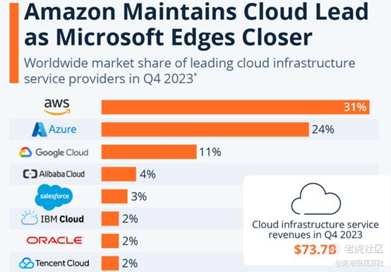尽管竞争激烈,尤其是最近人工智能作为潜在颠覆力量的崛起,AWS已经证明了其保持市场份额并保持领先地位的弹性(见下图)。AWS不仅保住了自己的地位,而且在过去的三个季度里,它的收入一直保持着12%的强劲增长。此外,考虑到接下来将讨论的令人难以置信的用户基础,其正在进行的将人工智能集成到其AWS和其他各种服务中的举措也令人乐观。